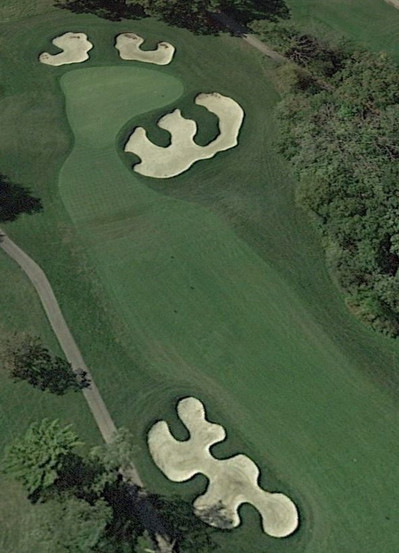 Pictured above is a golf hole in the middle of an in-house bunker renovation. The bunker on the left has new drainage and sand, the center bunker has been removed, and the rear bunker is good example of the condition before renovations. I was told center bunker was removed because it was difficult for older membership to carry the ball onto green. Unfortunately the resulting rough which replaced the bunker has only exasperated the problem and left the area looking rather unattractive.